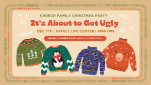 Southside family, get ready for our Church Family Christmas Party on December 7th—and it’s about to get ugly! Join us from 4-7 PM for a fantastic time of games, food, fellowship, carols, and so much more! Don’t forget to bring a finger food, a 2-liter soda, and wear your ugliest Christmas sweater. It’s going to be a blast—don’t miss out!