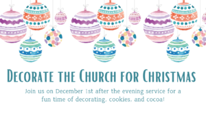 On Sunday, December 1st, we'll be decorating the church building as a church family following the evening service. We’d love for you to join us for this fun and festive time together! Enjoy cookies, cocoa, and great fellowship as we prepare our church for the Christmas season. See you there!
