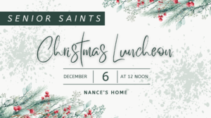 Senior Saints, join us at the Nance's home on December 6th at 12 PM for our annual Christmas luncheon! Come enjoy a delightful time of fun, fellowship, and time in God's Word. It’s a great opportunity to make new friends and strengthen existing ones. We can’t wait to celebrate with you!