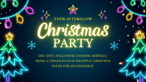 Southside Teens, get ready for our Christmas Party Afterglow on Sunday, December 15th! Join us in the Fellowship Hall for all the holiday fun and festivities. Bring a finger food, a Christmas sock, and a Christmas mug for a cheerful gift exchange! You won’t want to miss out on this exciting time together. See you there!